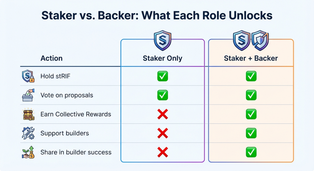 Alt Text: Comparison table showing Staker vs. Backer roles on RootstockCollective: both can hold stRIF and vote on proposals, but only Backers earn Collective Rewards, support builders, and share in builder success.