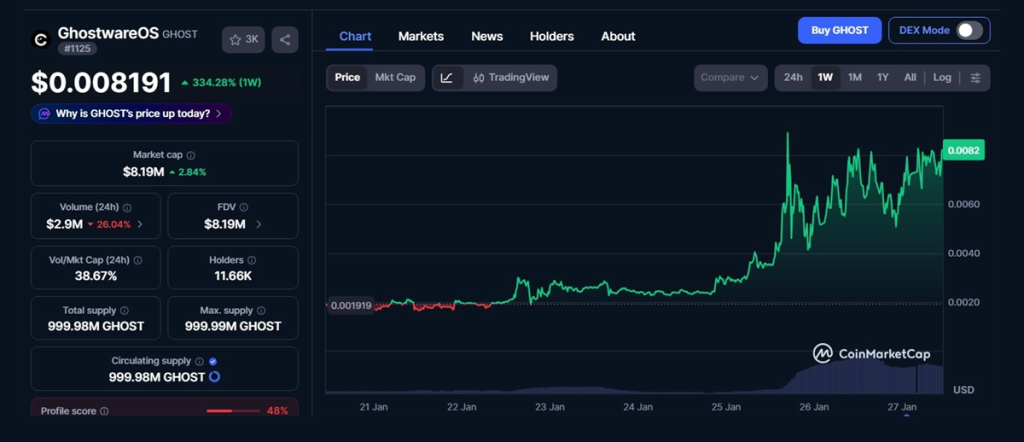 The announcement comes at a perfect time for $GHOST, whose market cap has increased by 400% in the last five days, skyrocketing from $2 million to over $8 million.