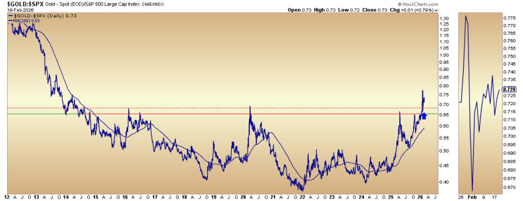 The ratio exploded to 0.78 before pulling back sharply during the recent metals crash. Importantly, it retested the breakout zone near 0.65–0.68 and held. The dashed support line highlights this former resistance-now-support area.