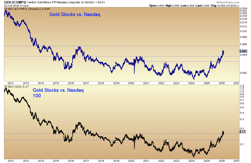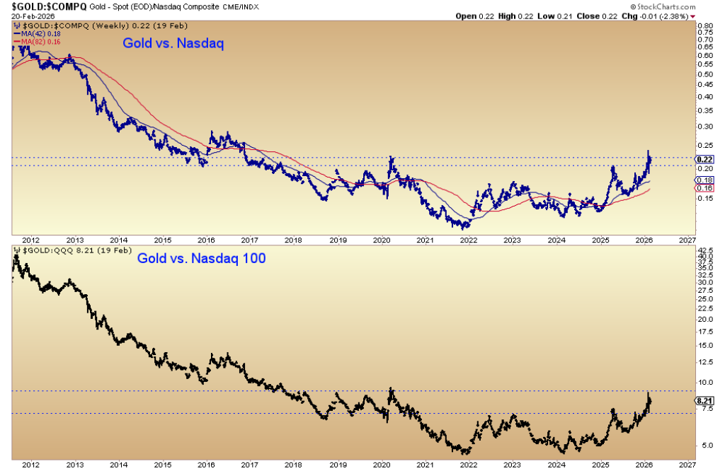 Two ratio charts—Gold vs. Nasdaq and Gold vs. Nasdaq 100—show gold pressing against or breaking above multi-year resistance.