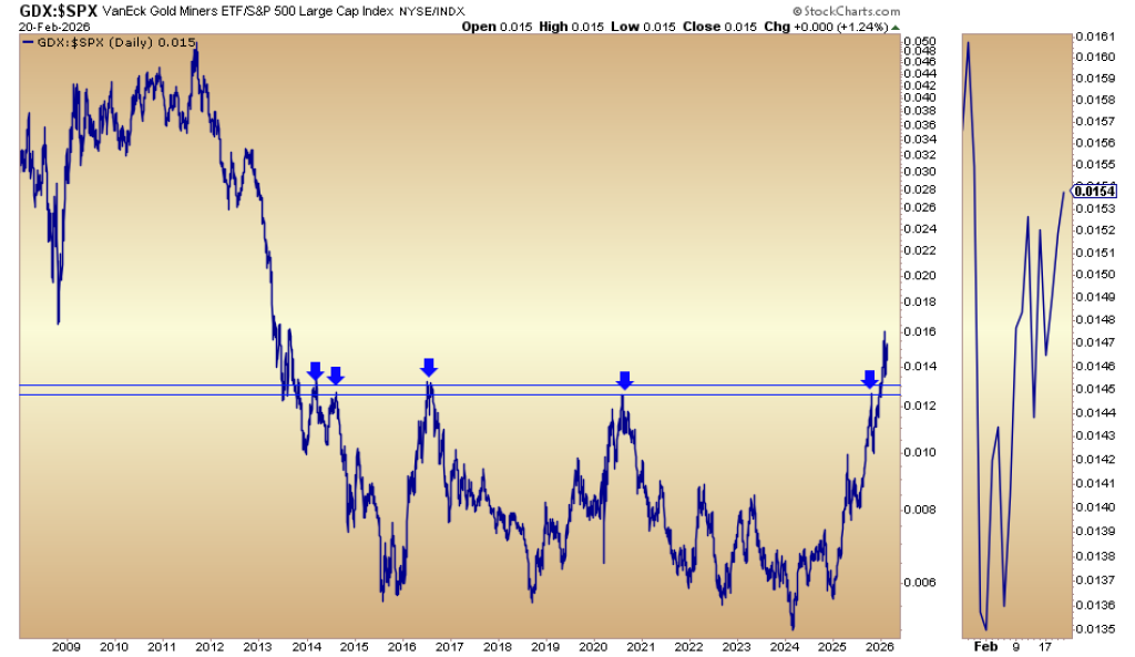 The GDX-to-S&P ratio chart shows gold miners breaking out from a 12-year base in late January.