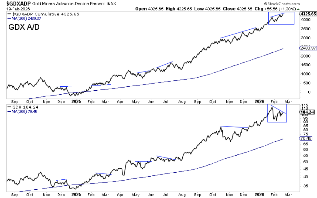 Notably, the A/D line made higher highs before GDX itself—highlighted by boxed regions on the chart. That positive divergence often acts as a leading indicator, signaling broad participation beneath the surface even when price hesitates.