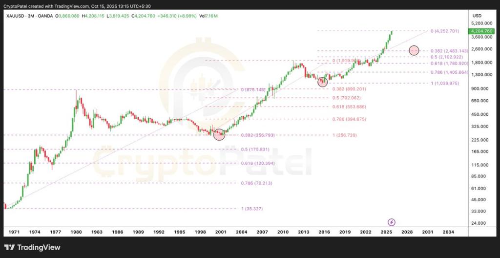 Now, in this latest leg, gold has climbed from that 2015 low near $1,050 to over $4,200, a nearly 300% rise in just ten years. The structure on Patel’s chart clearly shows that each bull cycle tends to overextend before revisiting a key Fibonacci retracement zone – typically between the 0.382 and 0.5 levels.