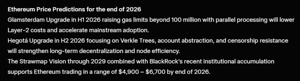 However, Grok AI is looking past the current weakness. It focused on Ethereum’s upcoming technical roadmap, specifically the Glamsterdam Upgrade in H1 2026, which will raise gas limits and lower Layer-2 costs, and the Hegota Upgrade in H2 2026, which will introduce Verkle Trees and improve decentralization.
