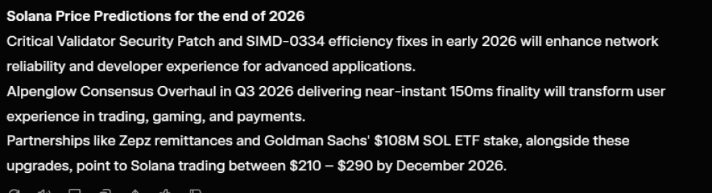 Combined with partnerships like Zepz remittances and Goldman Sachs’ $108M SOL ETF stake, Grok forecasts the Solana price trading between $210 and $290 by December 2026.