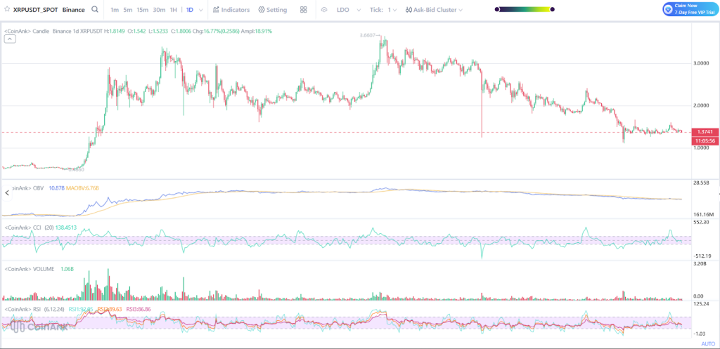 The (OBV, which measures the buying and selling pressure, has a strong uptrend, indicating investors are buying. The CCI is also high at 138. This tells us that the XRP price is moving with high momentum, well above its statistical average. In other words, XRP has broken out of its range and looks bullish.