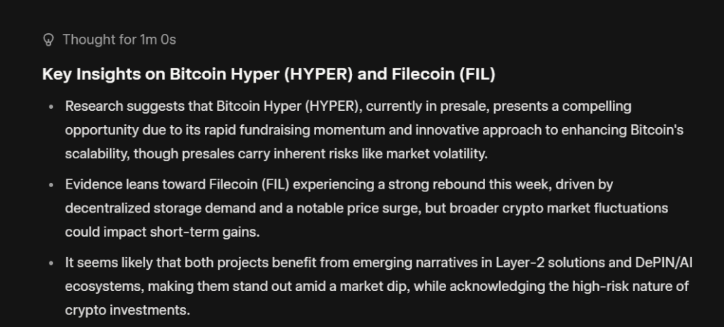 According to GROK’s data-driven prediction, the best crypto to buy this week could be a mix of high-risk, high-reward innovation and proven infrastructure: Bitcoin Hyper (HYPER) in presale and Filecoin (FIL) on the open market.