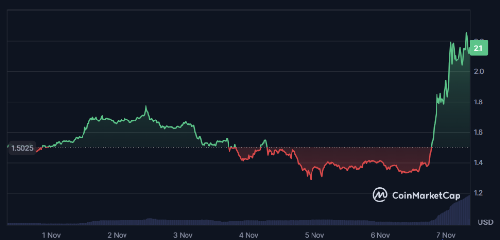 Filecoin’s price exploded more than 50% in the past 24 hours, jumping to around $2.10 with huge volume that mirrors ICP’s breakout earlier this week. In a sluggish market, that kind of move instantly puts FIL in the spotlight.