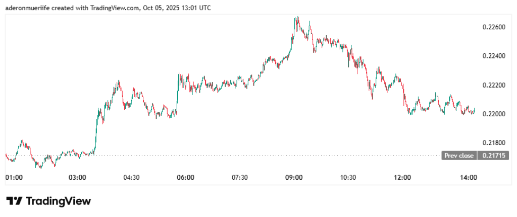HBAR trades around $0.220, recovering from its previous close of $0.217. Support is holding near $0.218, with resistance around $0.226. If momentum continues, analysts see potential for a move toward $0.24. Hedera’s network continues to attract enterprise developers thanks to its efficiency and predictable low-cost transactions.