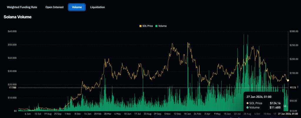 However, the positive Solana news has not affected the SOL price action. At press time, the crypto asset was trading near $125, down 5% in the past week. Trading activity has also eased during the pullback as spot volume dropped 9.5% to $11.4 billion, according to CoinGlass.