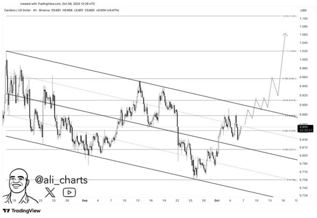 Ali’s chart shows ADA bouncing inside a falling channel. Fibonacci levels are drawn across the setup, marking key price zones. ADA is now near $0.88, just below the resistance.