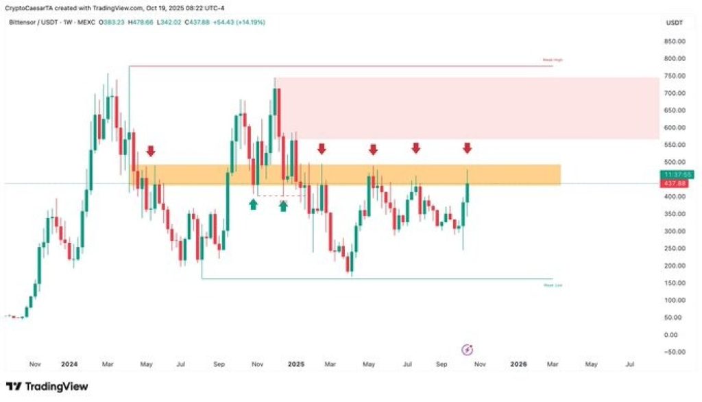 That yellow range represents a psychological and structural barrier. A strong weekly close above $500 could flip it into new support, opening the path toward the $700–$750 zone, which aligns with TAO’s previous all-time highs.