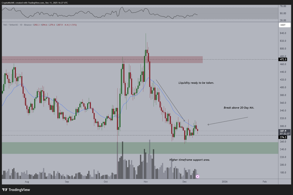 According to van de Poppe, if buyers step in after the halving and the TAO price clears resistance, a move toward $400 isn’t unrealistic. That zone lines up with prior price reactions and represents an area where liquidity could be taken quickly if sentiment flips bullish.