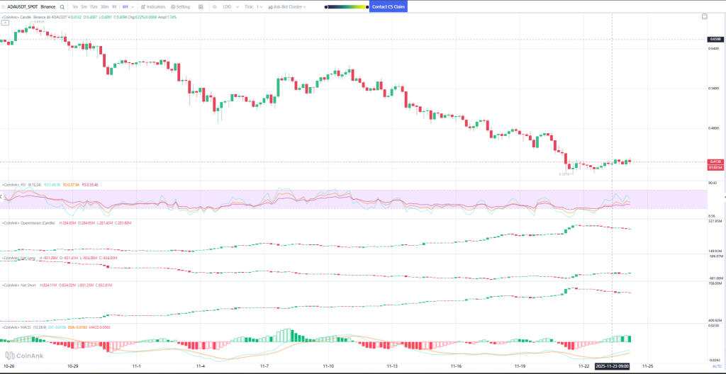 On the 4H chart, the ADA price has been trending downward since late October, falling from around $0.65 to last week’s low near $0.387.