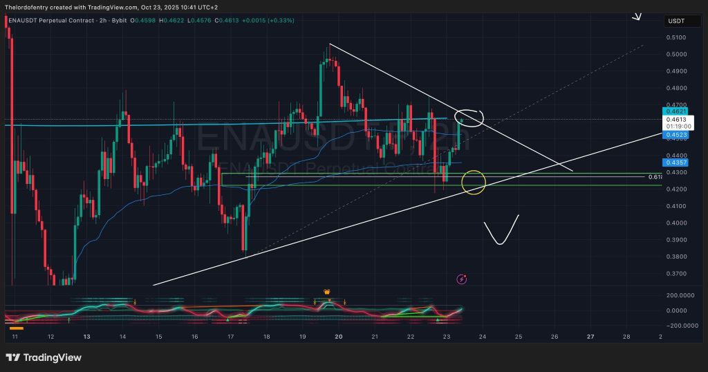 On the ENA chart, you can clearly see how price has been squeezing inside a symmetrical triangle, with higher lows building pressure against resistance near $0.47-$0.48.