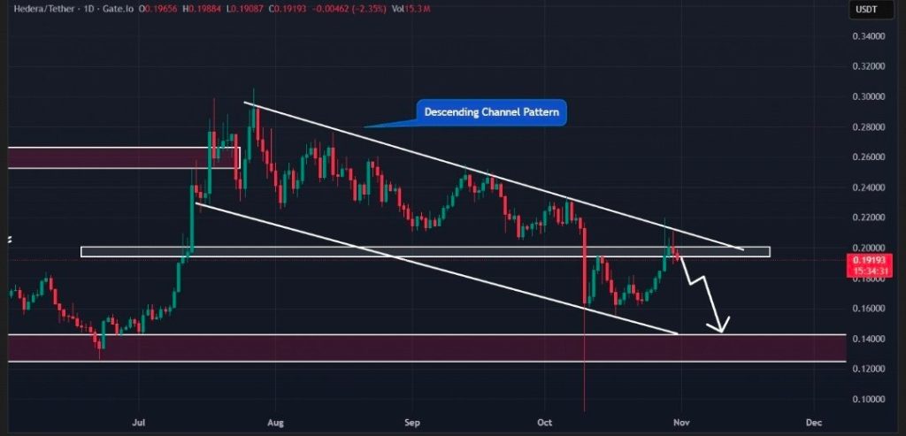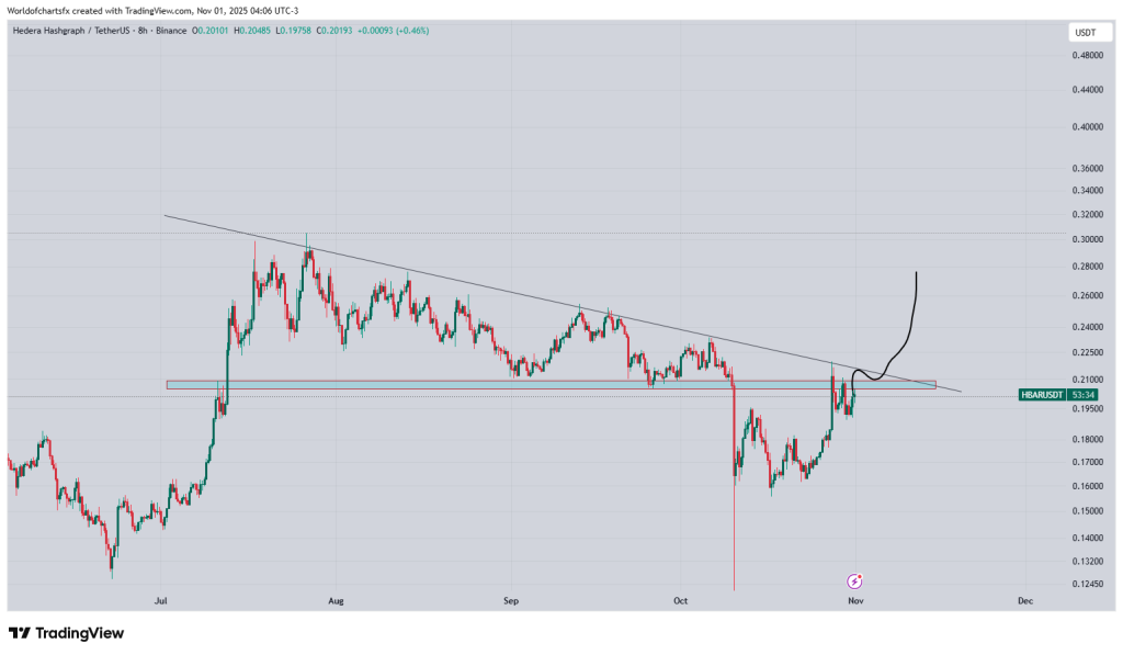 But as analyst WispOfDeFi points out, there’s a fine line here. The crucial support sits at $0.188, and if Hedera price falls below it again, the momentum could quickly reverse. That would put a move down toward $0.16–$0.14 back on the table.