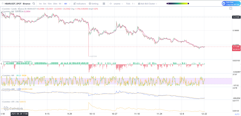 On the 4H chart, Hedera has been in a steady downtrend since late September, sliding from the $0.23 area to around $0.11–$0.12. The structure remains defined by lower highs and lower lows.
