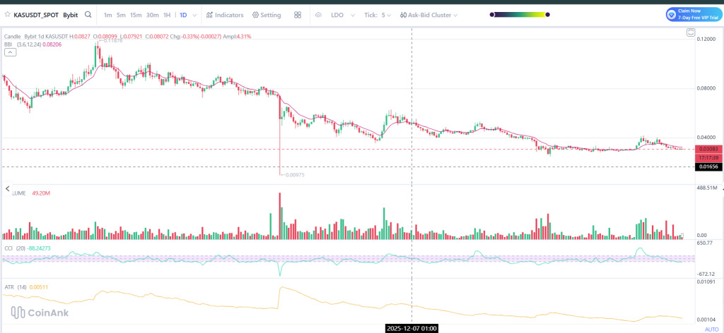 The indicators are showing a market that is quiet but not completely dead. The CCI is buried deep in the negative zone right now, which basically tells you KAS has been pushed down hard over the past few days.