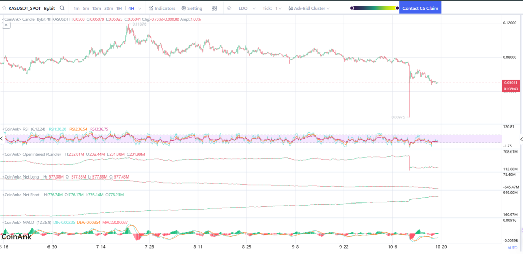 The big liquidation candle down to $0.0097 stands out. It was likely a combination of stop hunts and market panic, but it also showed where buyers were waiting. After that enormous wick, KAS bounced quickly back towards $0.05, although the bouncing slowed down.
