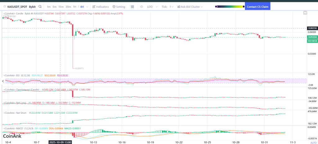 KAS price trades near $0.053 after a sharp mid-October breakdown and a slow recovery attempt. Price bounced from $0.045 support but continues to face resistance near $0.060.