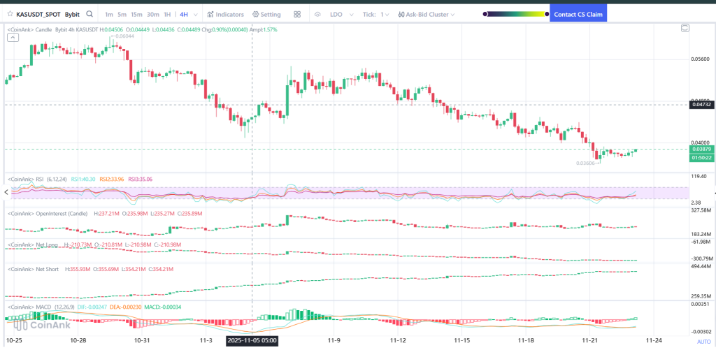The 4H chart shows a clear downtrend that started in late October, with KAS falling from around $0.047 toward last week’s low near $0.036.