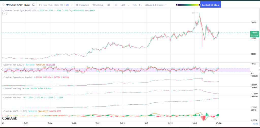The 4H chart paints a clear picture, MNT price has bounced off a strong support area around $1.45, forming a sharp V-shaped recovery. The price is now hovering near $1.88–$1.90, which is acting as resistance in the short term.