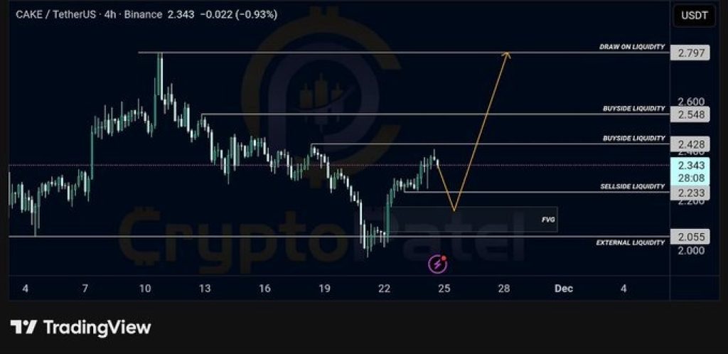 When you look at the 4H chart, the idea makes sense. The CAKE price already bounced nicely from the deeper liquidity zone near $2.055 and worked its way back above short-term sell-side levels. There’s still a gap below price, so a small dip wouldn’t be surprising at all.