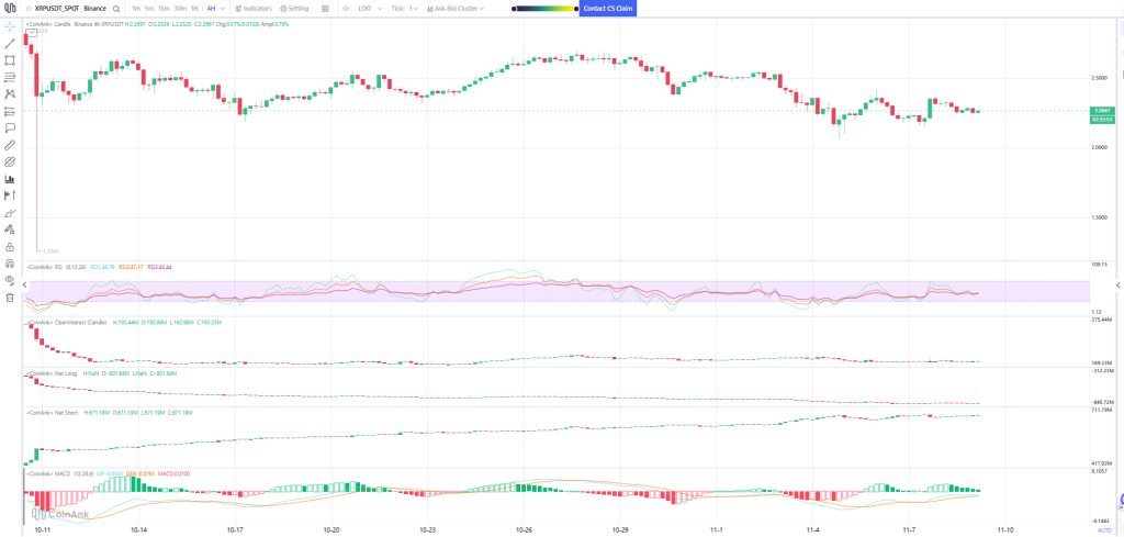 The long-versus-short positioning tells the same story. Shorts are slightly more active than longs, which could create a favorable environment for a short squeeze if XRP price reclaims the $2.30–$2.35 area.