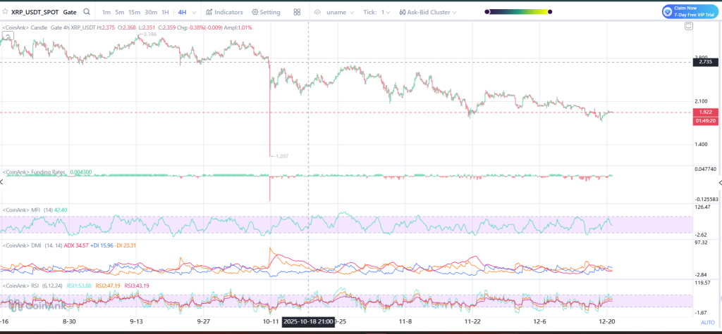 On the 4-hour chart, the XRP price is continuing in the definite downtrend following its rejection of the $2.73 resistance level. Currently, the market is sitting around the $1.92 price level, resting on top of a significant horizontal support area that has been held numerous times since the mid-November period.