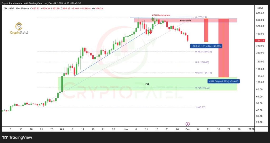 He’d been warning that the move above $700 looked overheated, and now that the ZEC price is sitting near $351, his call has aged perfectly. The coin has already fallen about 50%, and according to Patel, the move might not be finished yet.