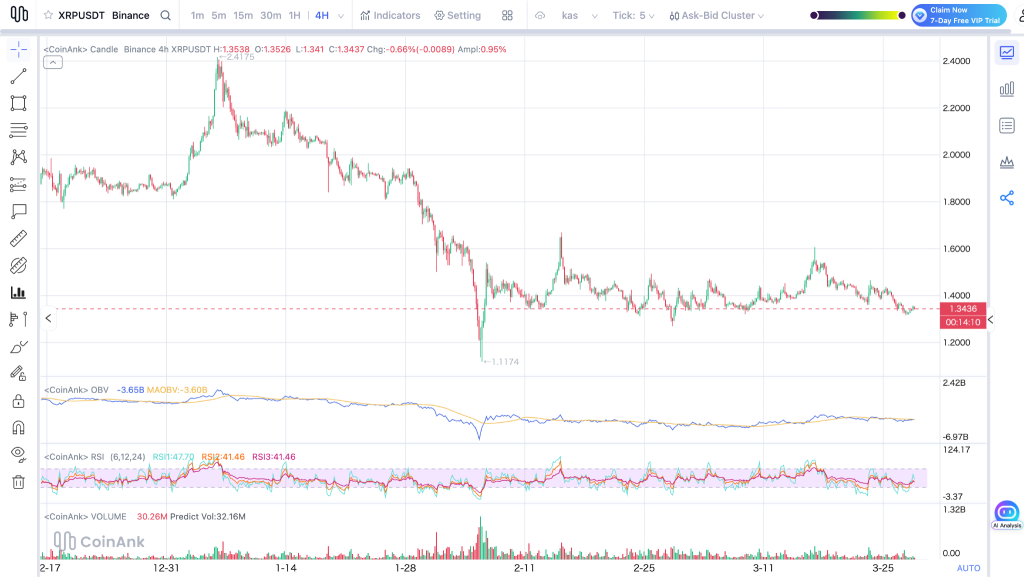 XRP is at $1.34 right now. To put that in perspective, we were near $2.40 back in January, so it’s been a rough few months. And honestly, the chart isn’t doing much to inspire confidence either. Price is below the 7-day, the 30-day, and the 200-day moving averages. That’s not one warning sign, that’s the whole dashboard lighting up.
