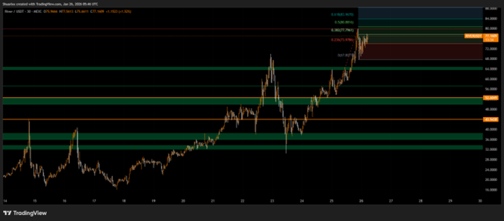A break above $80 would likely trigger another round of aggressive trading, with $90 and $100 acting as the next major psychological levels. On the downside, a loss of $72 would be the first sign that the rally is losing steam and that a deeper correction may follow for RIVER price.