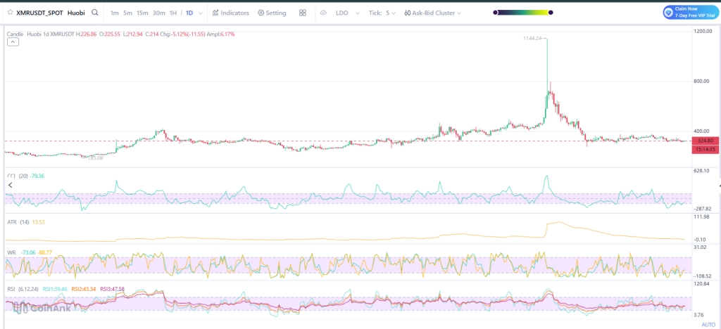 The Williams %R is sitting at -73.06, also flirting with oversold territory. That doesn’t guarantee a reversal, but it does mean the selling might be getting overdone. The ATR shows Monero moves about $13 to $14 per day on average, so volatility is still very much alive.