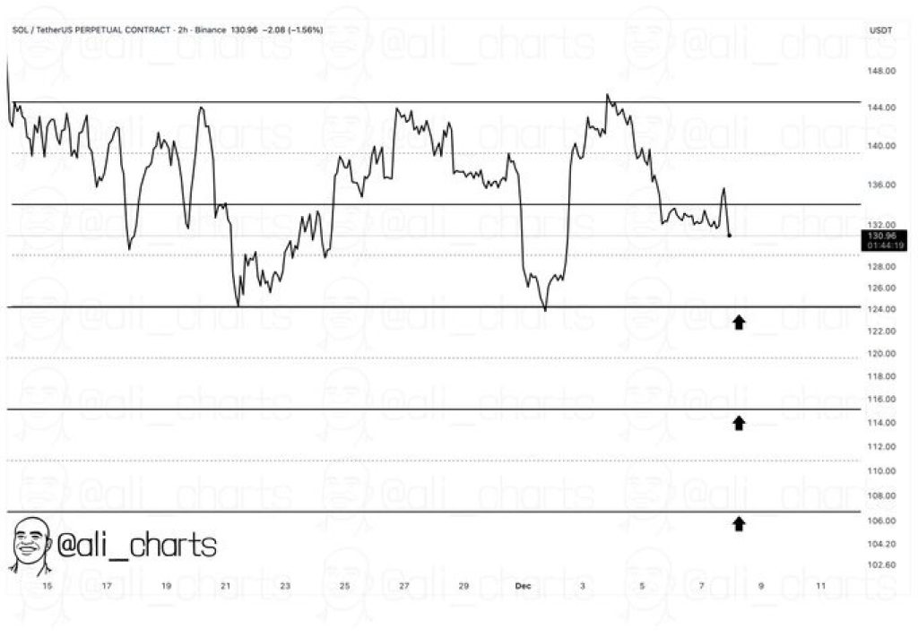 Ali’s message is straightforward: the entire short-term trend depends on $124. Hold it, and the chart stabilizes. Lose it, and the SOL price next move is almost certainly lower.