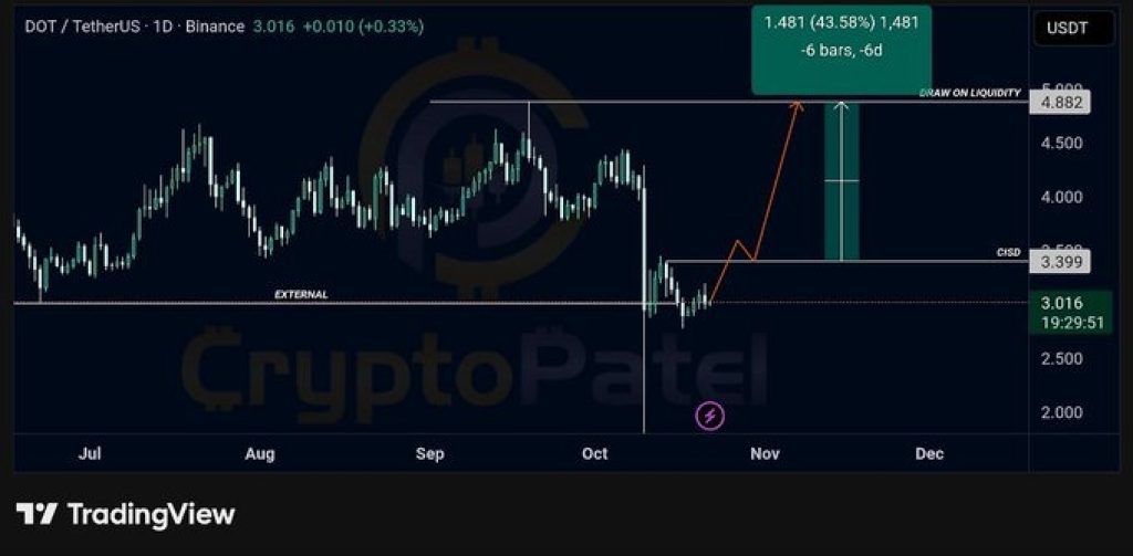 The daily chart shared by Patel shows DOT price consolidating tightly around $3.00–$3.40 after bottoming out earlier in October. This pattern signals market indecision but also hints at coiled momentum ready to unwind.