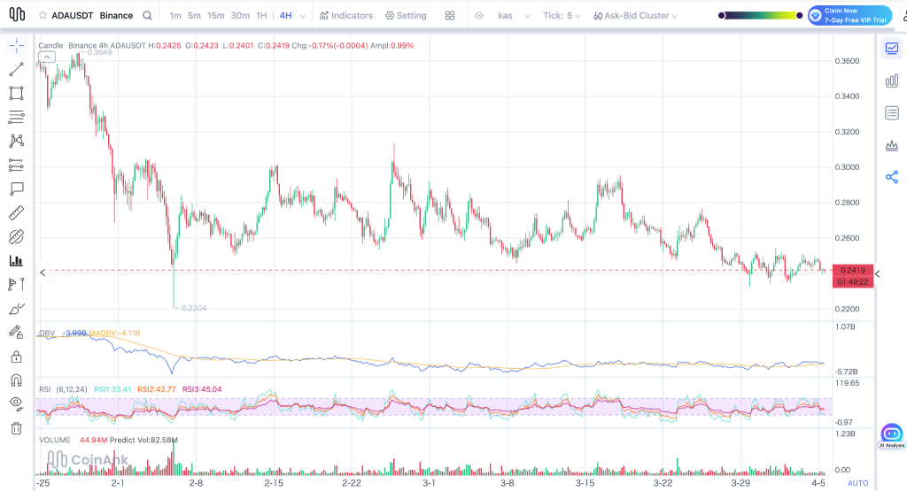 At the moment, the ADA price is around $0.2419, right on top of a key support level. This level has been held several times already, but there’s a catch: the more a support level gets tested, the more likely it is to give way. On top of that, every bounce since February has been weaker than the last, with lower highs forming each time. That’s usually a sign that sellers are still in control.