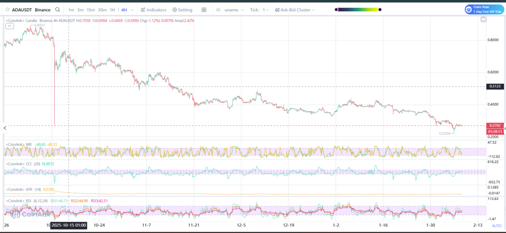 Looking at the 4H chart, the ADA price remains in a prolonged decline from the highs near $0.89. Price has been bleeding lower for months, with lower highs forming consistently and no major breakout attempt holding.