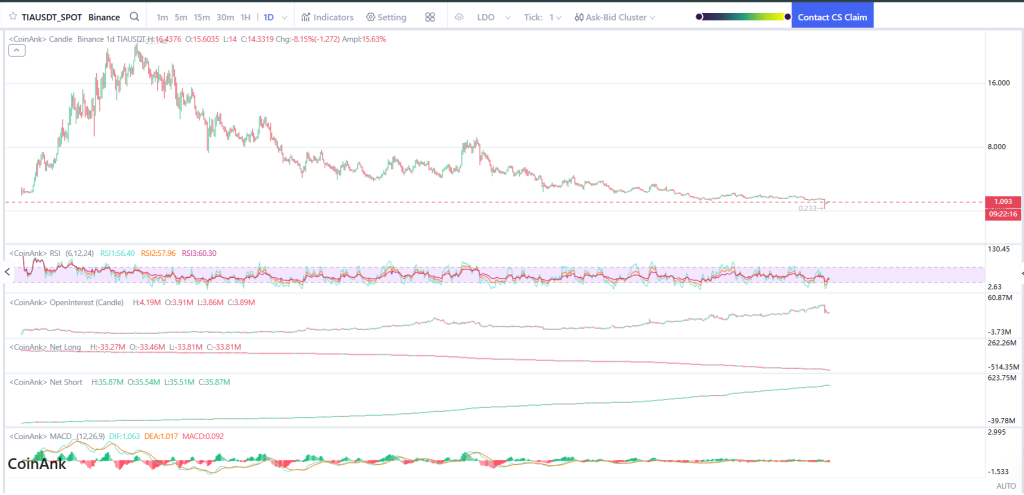 That jump came as Layer-2 tokens surged and U.S.–China tensions cooled a bit. But the move didn’t last long. Now, TIA is back under pressure, trading around $1.09, down roughly 8% in the past 24 hours. The bulls are still struggling to find their footing.