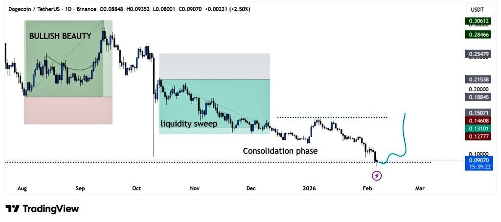 The chart labels this as a liquidity sweep, followed by the DOGE price settling into a long-term demand region. This is typically the area where markets either start building a base or break down further if buyers don’t show up.