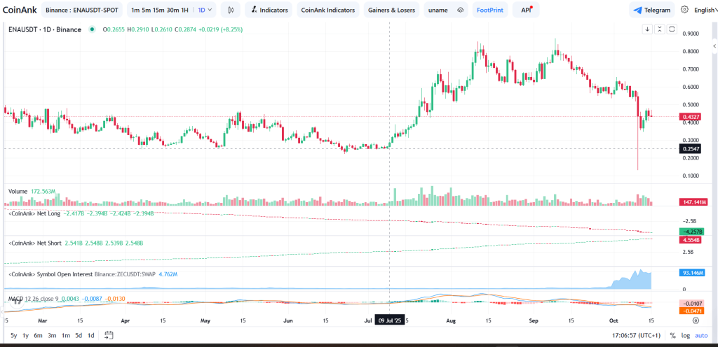 Looking at the daily chart, you can see how ENA price has bounced sharply off its lows. That $0.25 zone acted as a strong support, and the rebound toward $0.43 looks like the start of a new recovery wave.