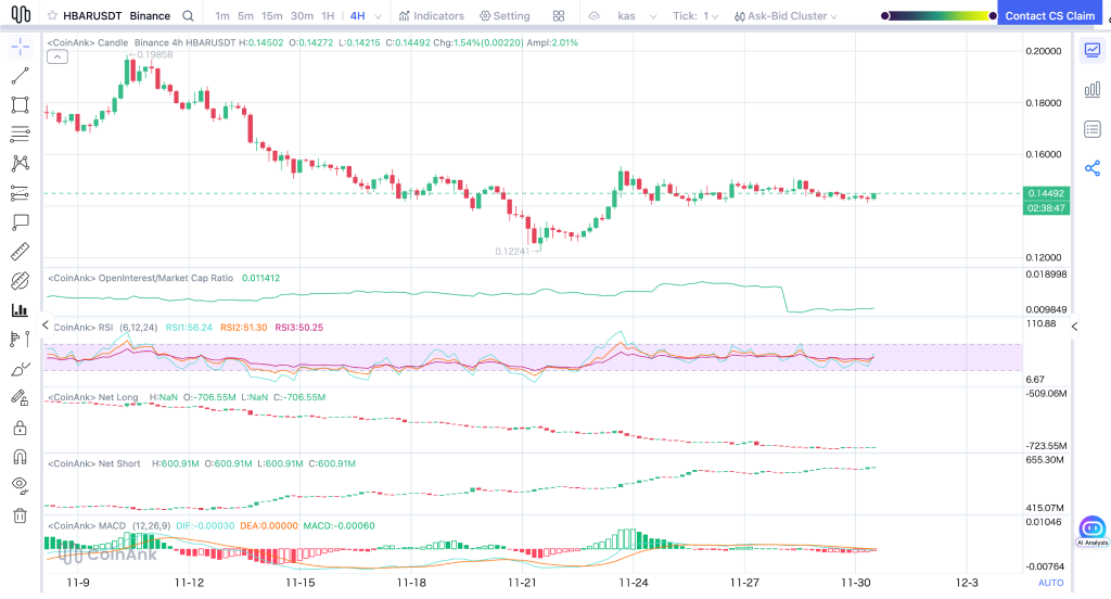 If the HBAR price holds above $0.14, a move back to the $0.155–$0.16 resistance area seems likely in early December.