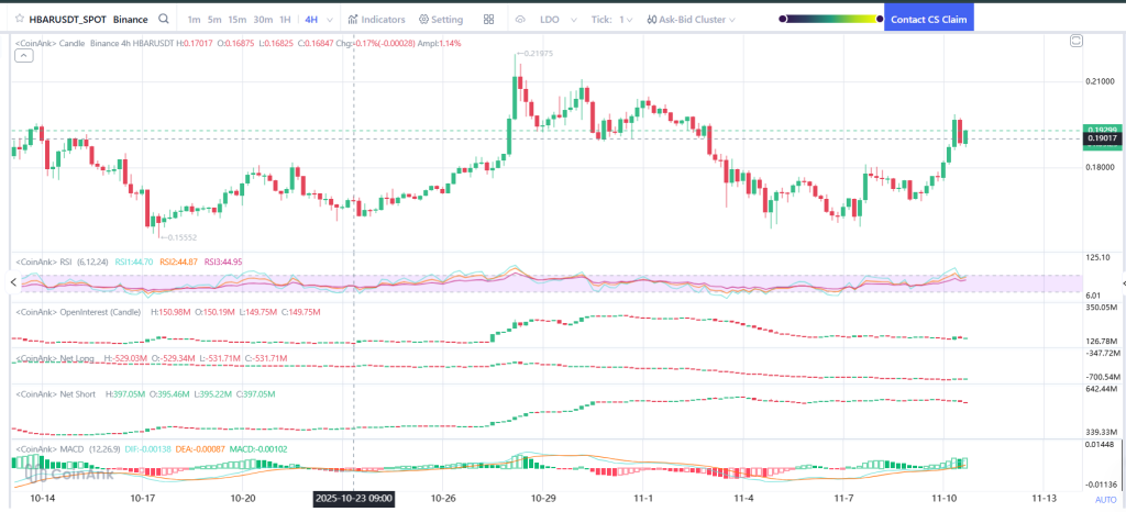 The 4H chart shows a clean bounce from the $0.155–$0.16 zone, which acted as a solid bottom. From there, buyers stepped in with real momentum, sending the HBAR price straight into its important resistance area around $0.19–$0.20. Late October, price even spiked up to $0.219, but it couldn’t sustain the breakout yet.