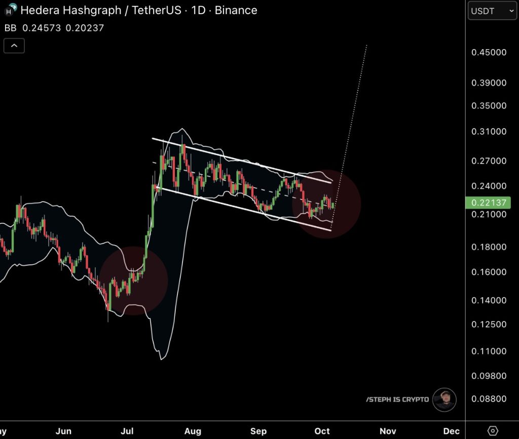 Meanwhile, on the charts, traders are spotting something interesting. Steph Is Crypto called it “$HBAR COMPRESSION!”, referring to a pattern where price volatility shrinks before a breakout.