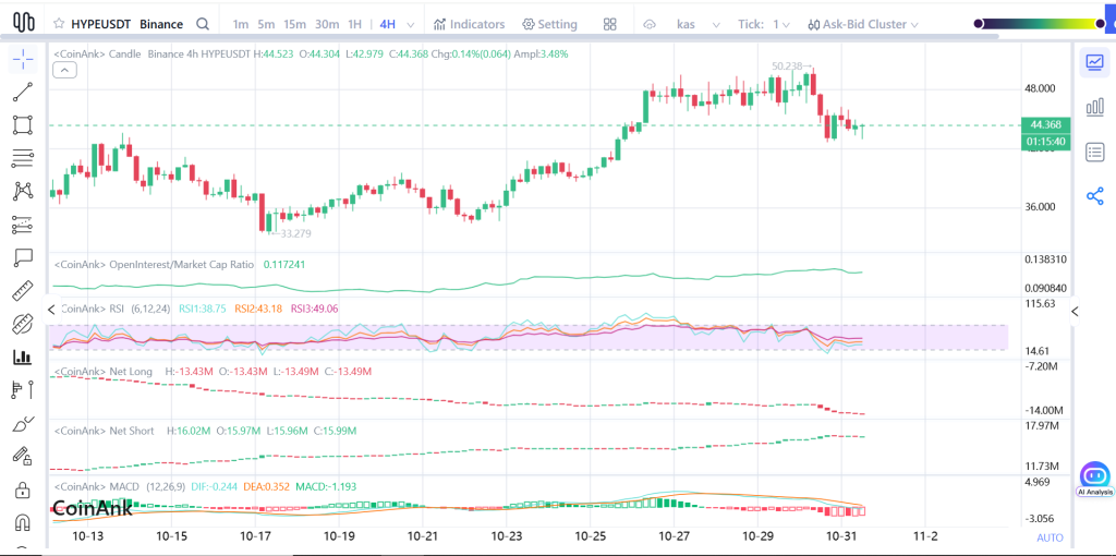 The bigger trend is still very much intact, and the chart looks like a classic “take a breather before the next move” situation. Right now, the HYPE price is drifting around $44.37, which puts us at a key turning point heading into November.