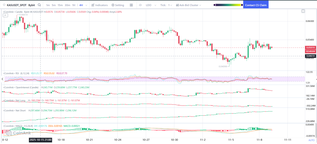The chart shows Kaspa trying to form a base above the $0.046–$0.047 zone. The sell-off on November 5 sent the KAS price into oversold territory, but the quick rebound back toward $0.050 helped stabilize things. The price has been choppy, but it’s holding steady for now.