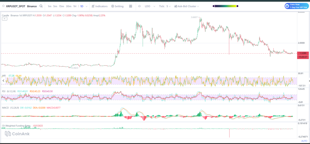 XRP is around $1.32 after falling from about $3.60. The chart keeps making lower highs and lower lows, so sellers are still in control.
