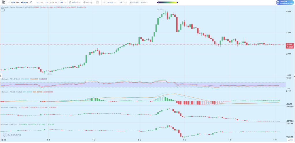 Over the past seven days, XRP’s price action has remained range-bound. After topping out near $2.40 earlier this month, price pulled back and has since traded in a narrow band just above $2.05. This behavior reflects indecision rather than strong selling pressure.