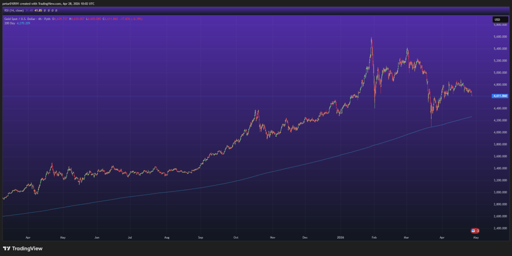 Gold has moved in a gradual downtrend during April, forming lower highs after its earlier peak while holding above key support near $4,500. The behavior points to a controlled pullback rather than a full reversal, with the broader uptrend still intact. Let’s examine the factors driving precious metals and forecast where silver and gold could head in May.