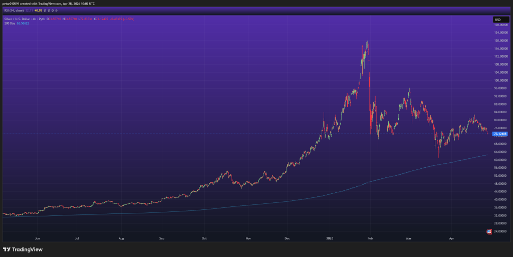 Silver has traded mostly sideways in April after its big February correction, holding a broad range between roughly $70 and $82. The silver price action shows consolidation and compression, suggesting the market is stabilizing and preparing for a larger directional move.