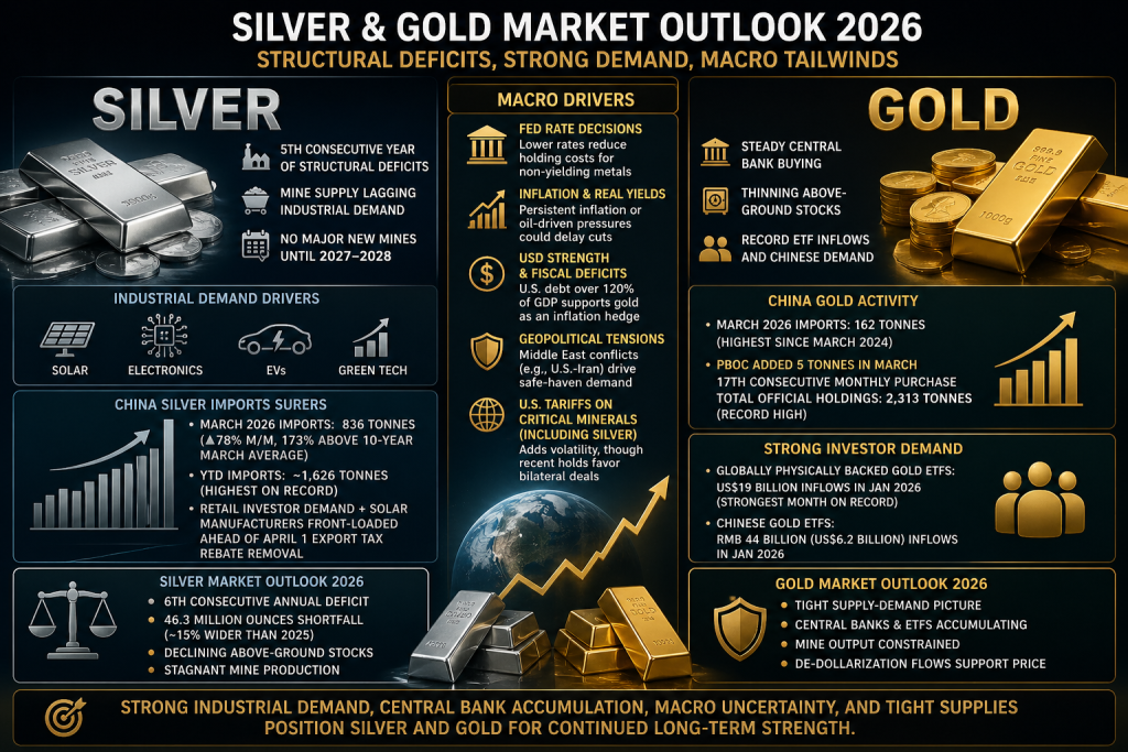 Silver faces a fifth year of structural deficits, with mine supply lagging industrial demand from solar, electronics, and EVs. New mine production won’t ramp until 2027‑2028. Gold benefits from steady central bank buying, while both metals see thinning above‑ground stocks amid record Chinese imports.